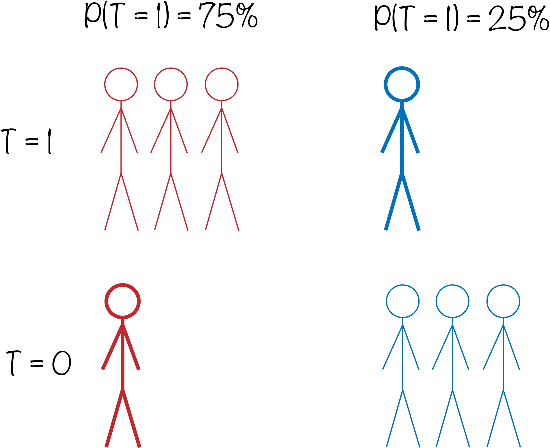 This is the basic idea behind inverse probability weighting. Individuals who were assigned to the treatment group even though they were much more likely to be assigned to the control group are a rare, and valuable breed. We want to give their outcomes as much weight as possible, whereas the much larger group of individuals who were placed in the expected treatment group need less weight, simply because we have much more information on individuals like this.